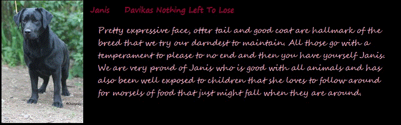 Click on any photo for more details about our girls here at Davikas Labrador Retrievers. All our breeding dogs are carefully selected to maintain the qualities in our breeding program that we admire about the labrador retriever and that make them the biddable companion that is so desirable to others. We focus on appearance, temperament and soundness and lastly titles. |